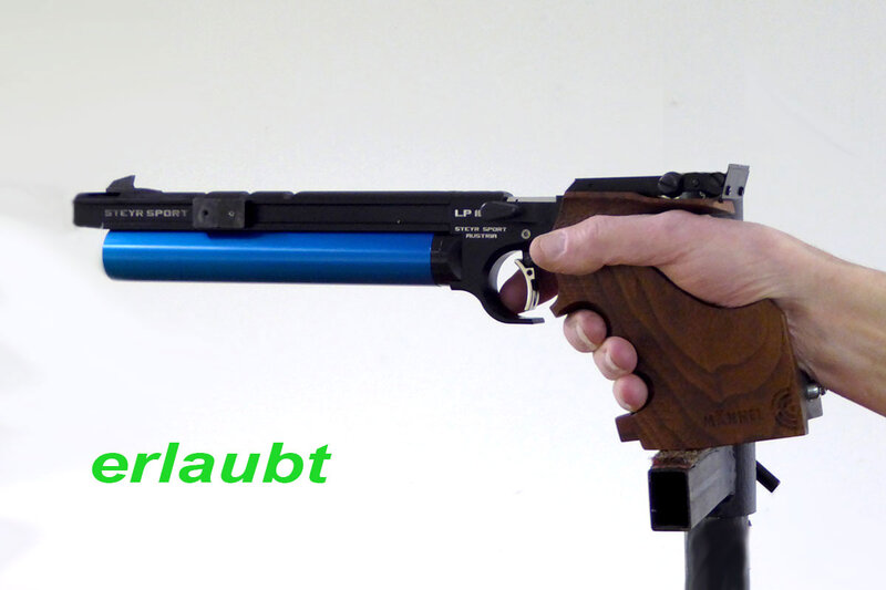 Einschüssige LuftpistolePistolen mit Luft- oder Gasdruck im Kaliber 4,5 mm (.177) und einem Abzugsgewicht von mindestens 500 g. Die äußeren Maße dürfen 200 mm in der Höhe, 420 mm in der Länge und 50 mm in der Breite nicht überschreiten. Gewicht maximal 1,5 kg. Mehrlader dürfen nur als Einzellader verwendet werden.