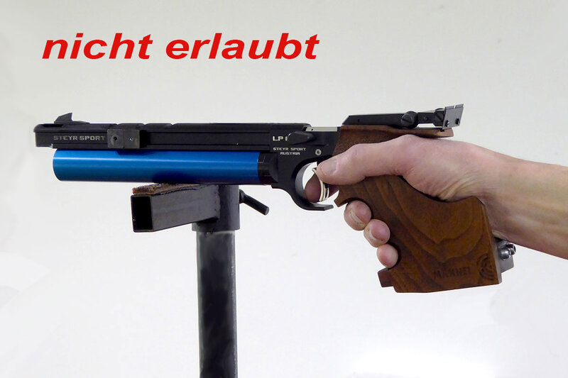 Stehend aufgelegt:Der Pistolengriff wird auf die Auflagevorrichtung aufgelegt und es dürfen sogen. Auflageplatten verwendet werden. Die Pistolenabmessungen und das max. Pistolengewicht müssen mit der montierten Auflageplatte eingehalten werden (Maße siehe oben). Die Unterseite des Pistolengriffes oder der Auflageplatte, darf mit keinem rutschhemmenden Material (z.B. Schleifpapier) versehen sein. Es wird einhändig geschossen, die zweite Hand darf nicht mit der Waffe oder Auflage in Berührung sein.